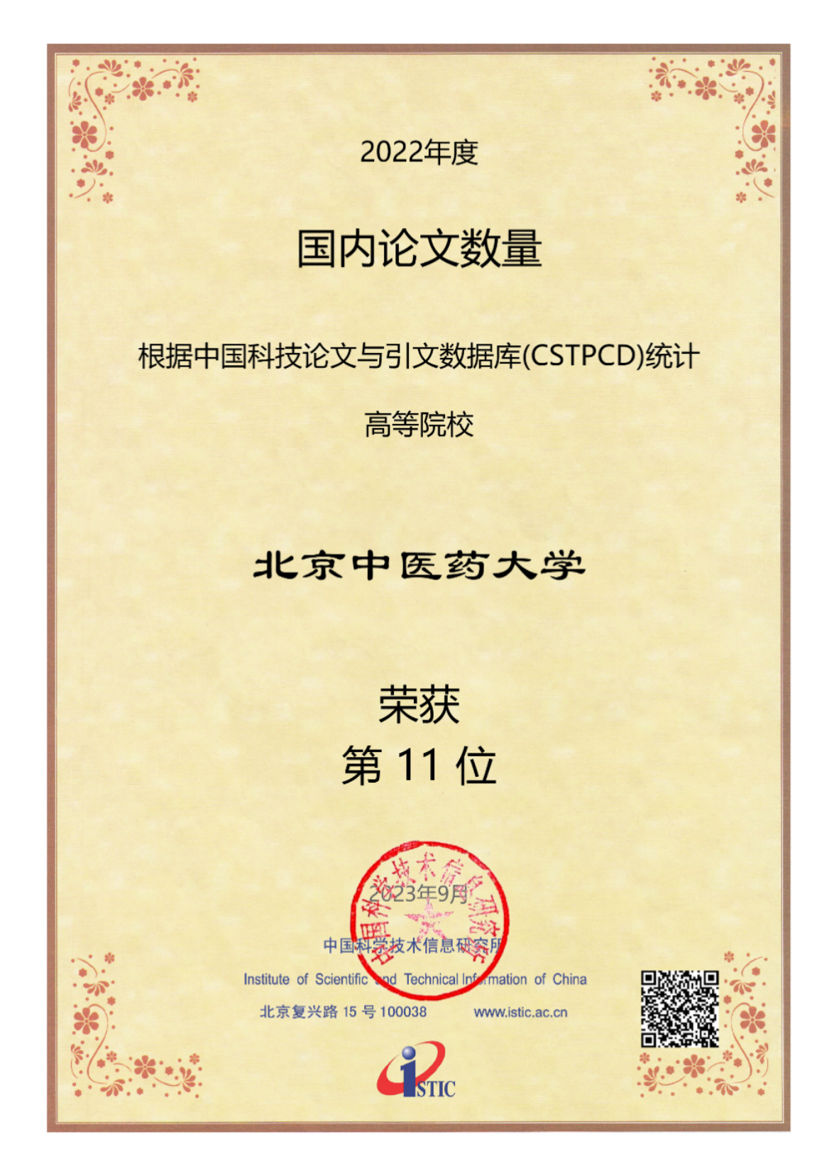 根据中国科学技术信息研究所(ISTIC)最新发布的数据,我校2022年论文发表情况再获丰收。