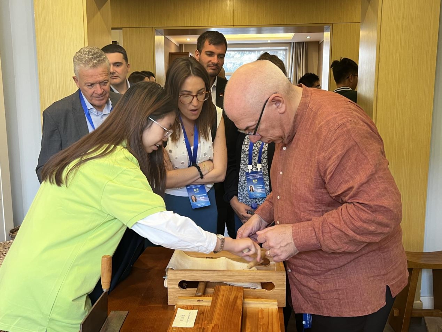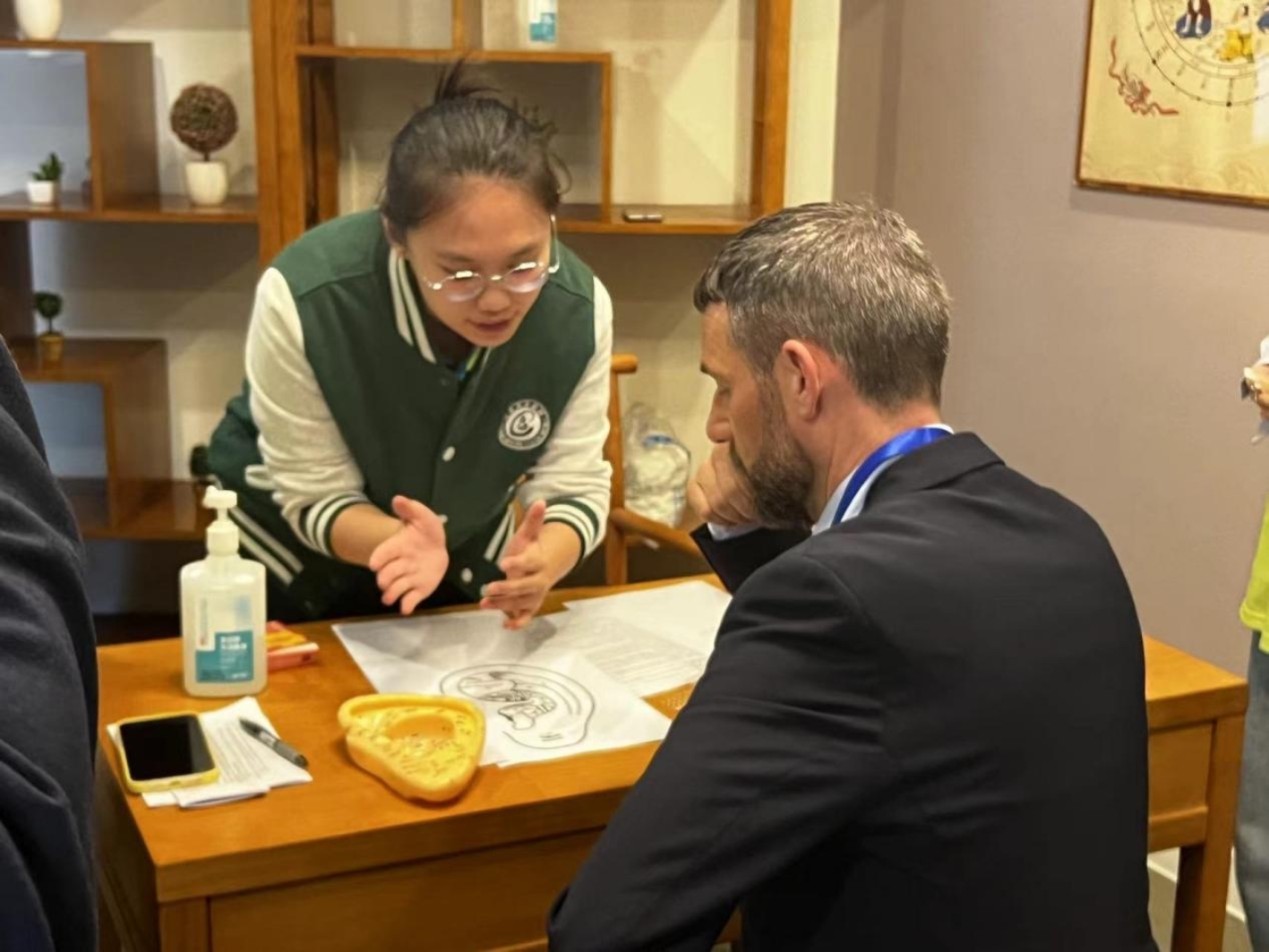 活动伊始,学校国家中医国际传播中心王珊珊副主任代表学校对各位贵宾的到来表示欢迎,并由王乐鹏副教授为来宾介绍我校自主研发的时间医学钟。随后,来宾在学校学生志愿者的介绍下参观了一层杏林苑百草堂、驻颜坊、养心斋等展室,并在造药局体验制作艾灸条、针推阁体验经络循行、功夫阁体验导引养生功法、九体堂体验我校研发的双语云体验系统-中医体质模块,四诊堂体验现代中医望诊仪、脉诊仪,逐步加深了对中医药文化的了解。
